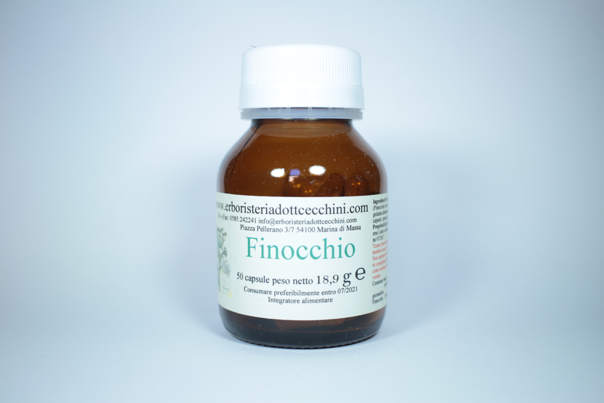 Indicazioni e Proprietà: “Finocchio” adatto contro gas, aria gonfiori al ventre ritenzione idrica , si consiglia l’uso quotidiano 1 o 2 capsule secondo necessità prima del pasto da ai pasti a