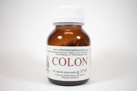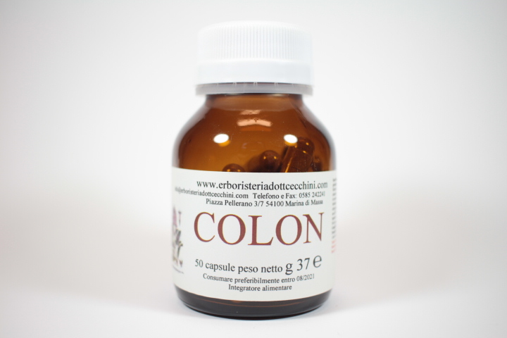 “Colon” integratore in capsule utile contro colite, colite spastica, alternanza di diarrea e stitichezza, disordini intestinali in genere, si consiglia assumere 1 capsula ai tre pasti